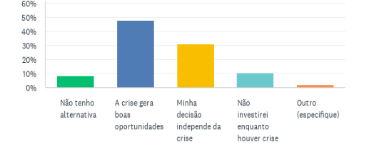 A Crise como Fator Motivacional Interno: Surpreendentemente, 50% dos participantes veem a crise atual como uma oportunidade para empreender, enquanto outros 30% afirmam que sua decisão de investir independe de crises externas. Isso destaca a motivação intrínseca desses profissionais para o empreendedorismo.