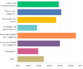 Prioridade na Rentabilidade: A análise dos atributos de um negócio revelou que a rentabilidade é o fator mais valorizado, seguido pela lucratividade e pelo risco do negócio. É notável que o “payback” seja colocado em uma posição menos relevante, evidenciando a abordagem criteriosa desse público