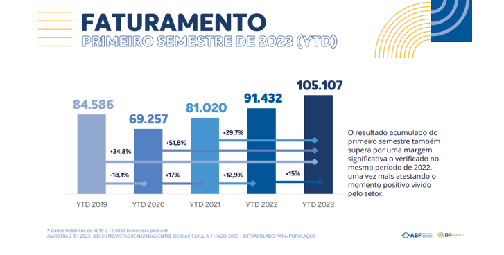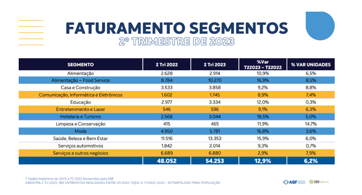 A primeira informação relevante é o crescimento de 15% do faturamento do Setor quando comparamos o primeiro semestre de 2022 com 2023. Isso demonstra capacidade de reagir a crises que o sistema de franquias proporciona aos agentes econômicos que se utilizam desta estratégia de negócios.