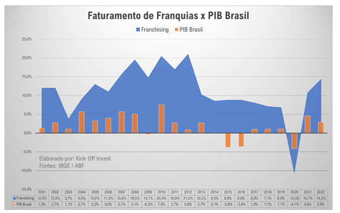 A Kick Off Invest fez um comparativo do histórico do crescimento do faturamento do setor de franquias com o PIB do Brasil.