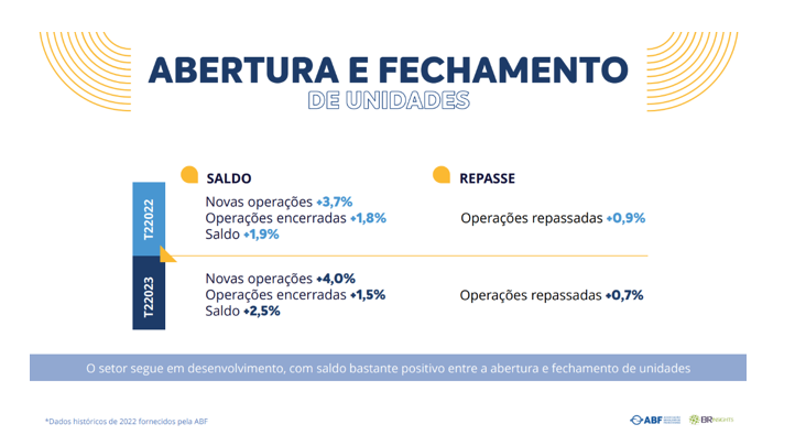 No quesito abertura e fechamento de unidades franqueadas, os números chamam a atenção, demonstrando não só um saldo positivo de 2,5% no número de operações, uma aceleração de 32% deste crescimento quando comparado com o mesmo período de 2022.
